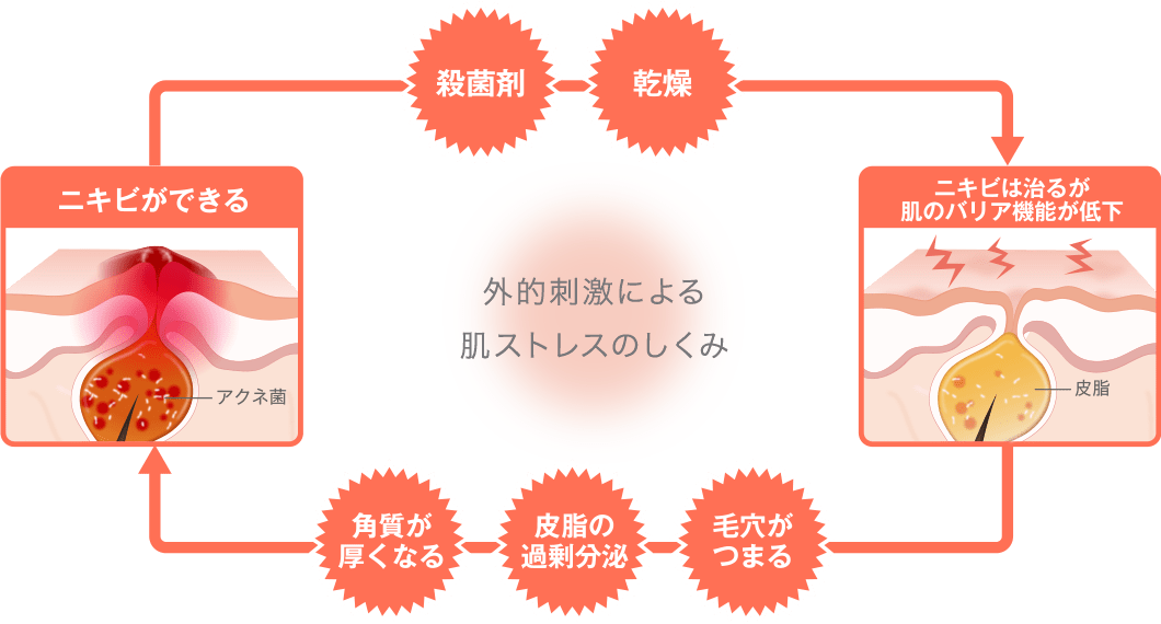 バリア機能の低下により、皮脂の過剰分泌や角層が厚くなるため、ニキビの原因になります。
