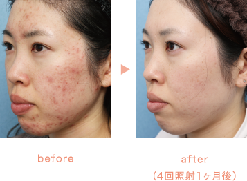 新しいニキビを治していく治療とニキビ跡の赤みを治していく治療を同時進行に治療していくのが、早く治していくポイントになりますので、フォトフェイシャルM22 のアクネモード+ 赤ら顔モードをダブルで照射しました。フォトフェイシャルM22のアクネモード+赤ら顔モードのダブル照射4回治療、約4ヵ月ですっかりキレイになりました。今後はニキビ跡の凹凸をフラクセルやeマトリックスなどの治療をしていく予定です。