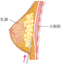 乳房下溝から細いカニューレを挿入し、乳腺の下のレトロマンマリーファットティッシュスペースに脂肪を細かく分散しながら注入する。