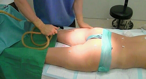 手術は全身麻酔下に行い、最初に太もも全体とお尻から脂肪吸引し、注入用濃縮脂肪を作成しました。