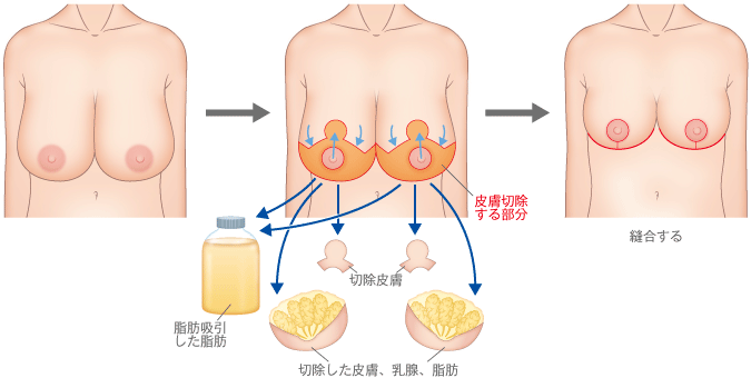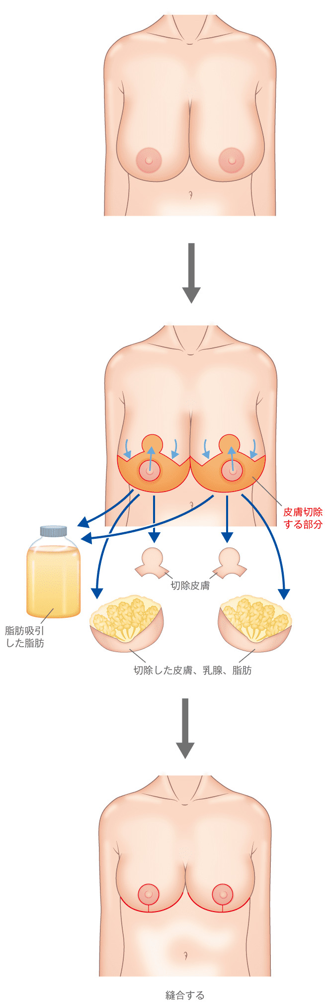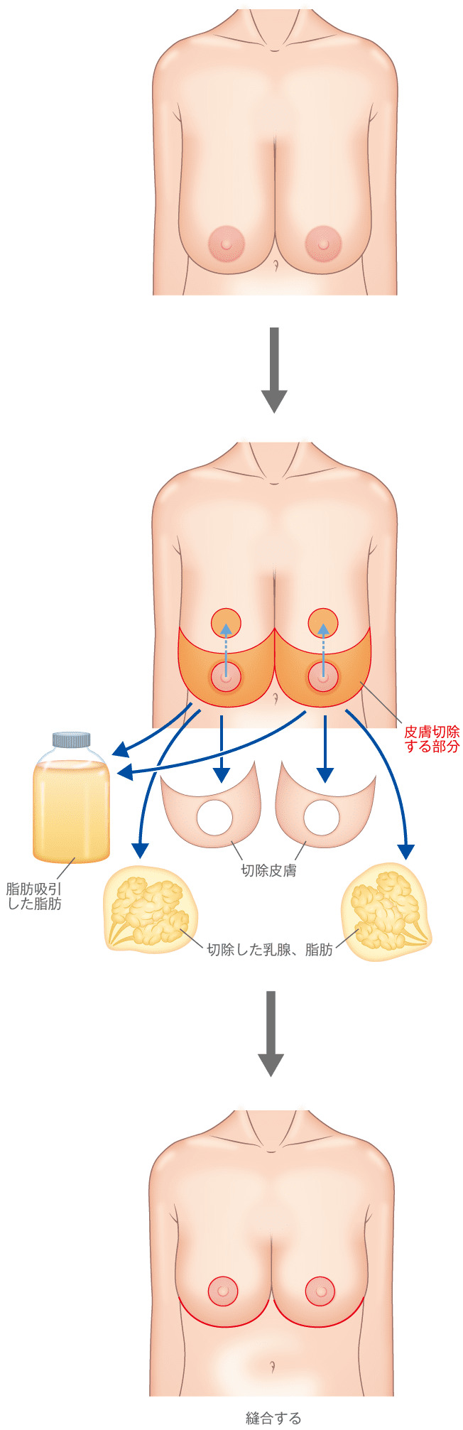 手術は、乳房の余分な皮膚のたるみと脂肪を取り除き、下がった乳腺を引き上げて固定します。
