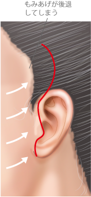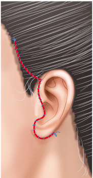 耳の前の切開は、耳介の輪郭に沿って切開し、耳珠の前を切開するのではなく、耳珠の出っぱりの後ろを切開するので、傷跡は目立たなくなる。