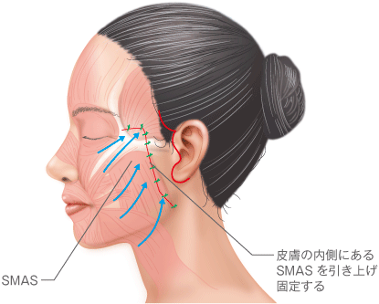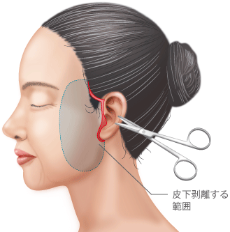 こめかみの有髪部(髪の毛が生えている部分)から耳の前、耳たぶの後ろにかけて皮膚を切開し、頬のSMAS(スマス)という筋膜組織と首の筋肉である広頸筋(プラティスマ)を引き上げ固定し、余分な皮膚を切除する手術です。