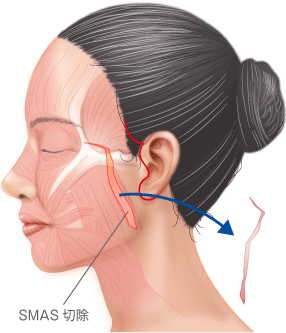 SMAS、プラティスマの一部を切除する。