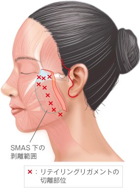 単に皮膚を切って縫うだけではなく、筋膜下の支持組織であるretaining ligament(リテイニングリガメント)を切離し、面と面でたるんだ組織の位置関係を修復し、筋肉や筋膜を引き上げて固定するため、リフトアップ効果が強く、後戻りもしないため、効果は半永久的に持続します。