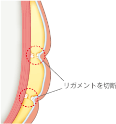 強固なリガメントを利用するリガメント法では、皮膚を骨に固定しているリガメントをはずし、そのリガメントをリフトのアンカーとすることで、広範囲の皮膚を引き上げられます。