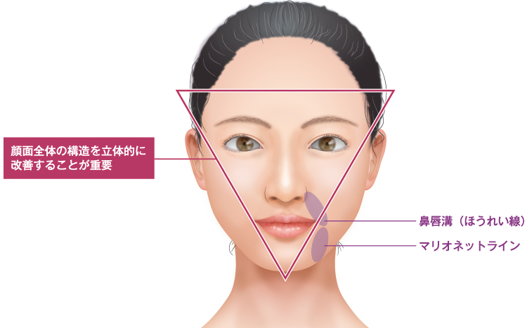 こうした症状を改善するには、しわが出ている部分だけを治療するのではなく、原因となる骨格、筋肉、皮下脂肪などの影響などを考え、お顔全体の構造を立体的に改善することが重要です。