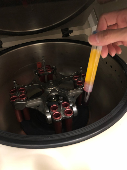③PRP液の完成。上の黄色い部分を使用します。③多血小板血漿液の完成。上の黄色い部分を使用します。