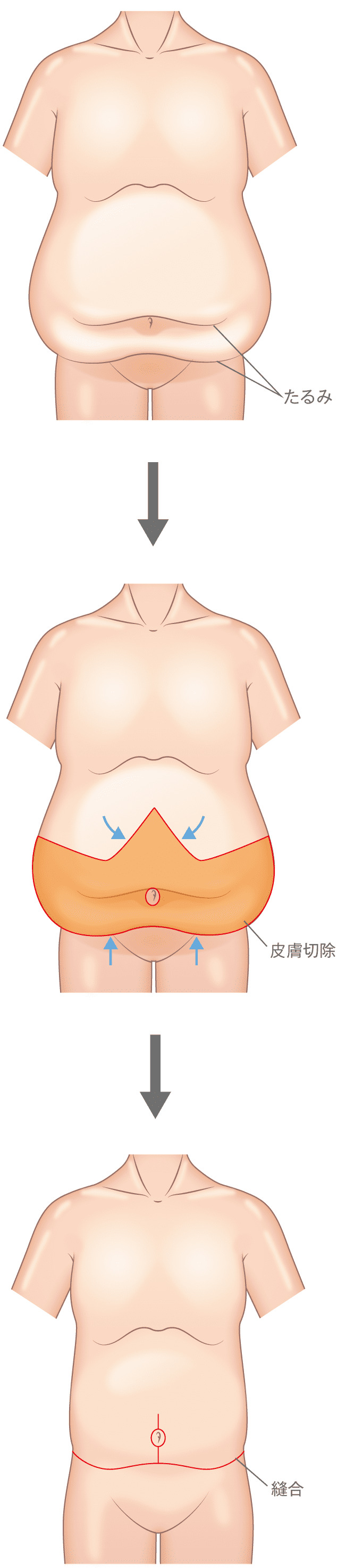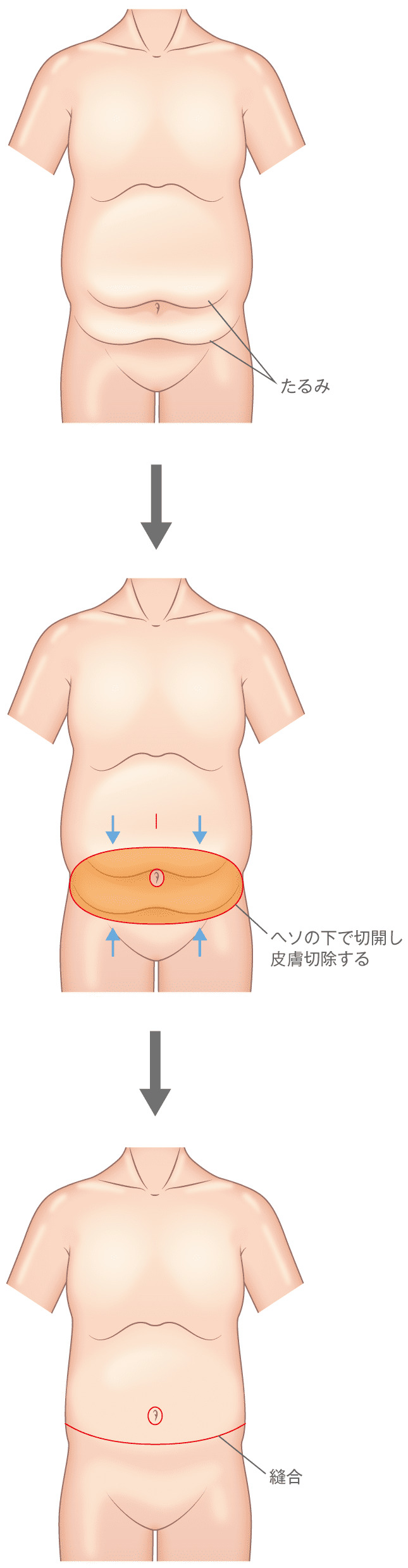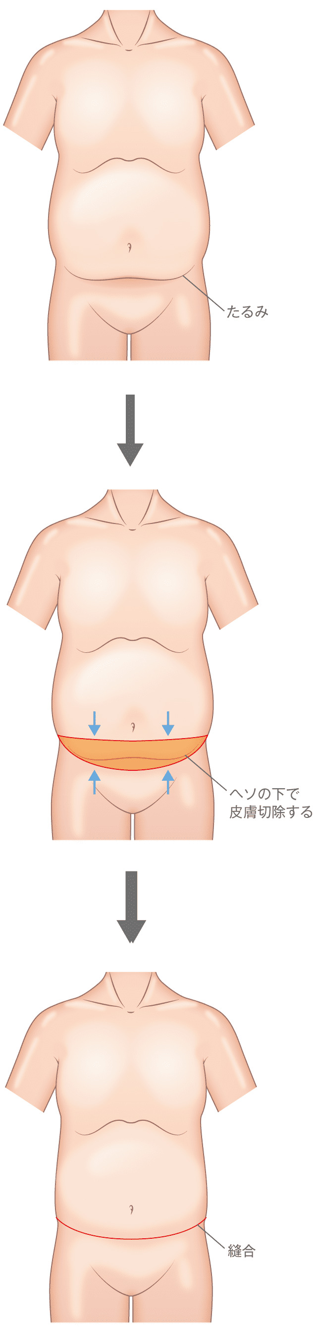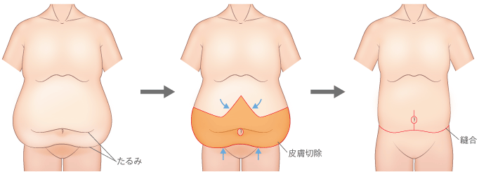 お腹のたるみ取り手術は、お腹周りの余分な皮膚を切除し、縫合します。
