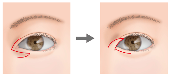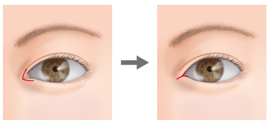 目頭側の皮膚を切開して皮弁を作り、その皮弁で涙丘を覆い隠すように下に回し、縫合します。デザインがしやすく、正しく手術を行えば後戻りも生じないため、安定した結果を得られやすいうえ、下向きの自然な蒙古ひだになります。