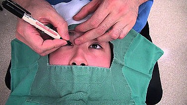私(高須幹弥)の場合、手術前に麻酔の点眼薬(目薬)をし、目元の皮膚に麻酔クリームを塗ります。10分くらい経過すると、目元の感覚が鈍くなってきます。その後、デザインをし、手術部位を消毒して、局所麻酔の注射をします。