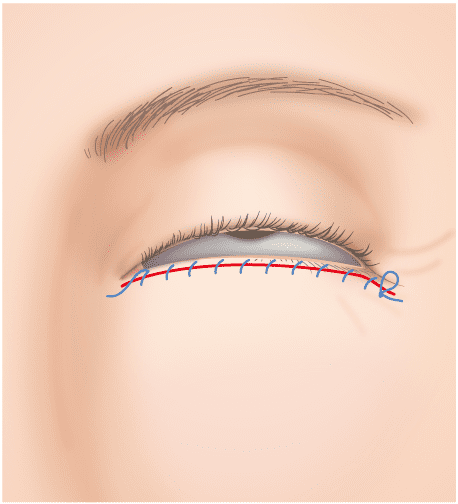 下まぶたたるみ取り手術は、下まぶたのまつ毛の生え際に沿って皮膚を切開し、内部の処理をした後に皮膚を縫合します。