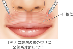 ボツリヌストキシンを、口周りの筋肉(口輪筋)に注入します。