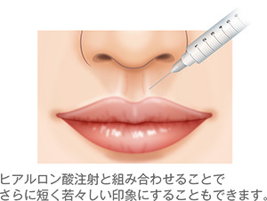 ヒアルロン酸で、唇をより立体的にボリュームアップさせ、ハリのある唇を作り、さらに鼻の下を短く若々しい印象に改善します。