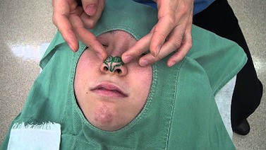 鼻の下の方のみを操作する手術であるため、鼻ギプスは比較的小さめのものを用い、鼻の下の方のみを固定します。