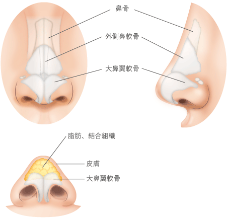 余分な軟骨を切除するなどの処理を行えば、処理された軟骨の上に薄い皮膚が被さるため、鼻先を細くする効果が確実に出やすい。 |