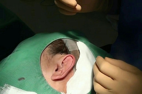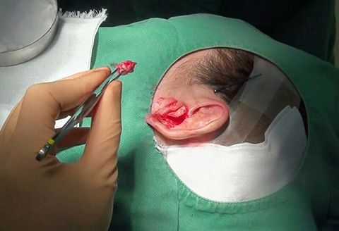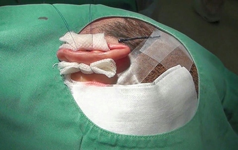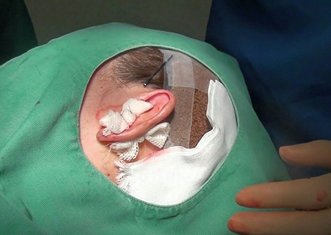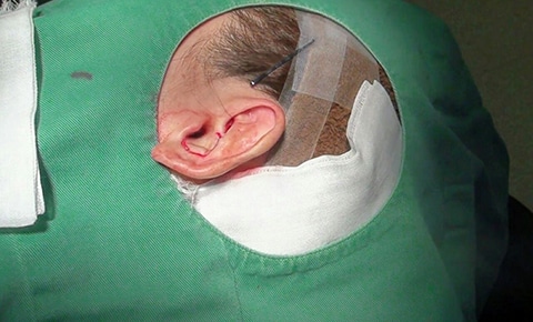 最後に枕固定をするために、4-0ナイロン糸で耳介を貫通させます。