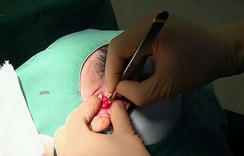 局所麻酔がよく効いたら、メスでデザイン通りに皮膚切開します。